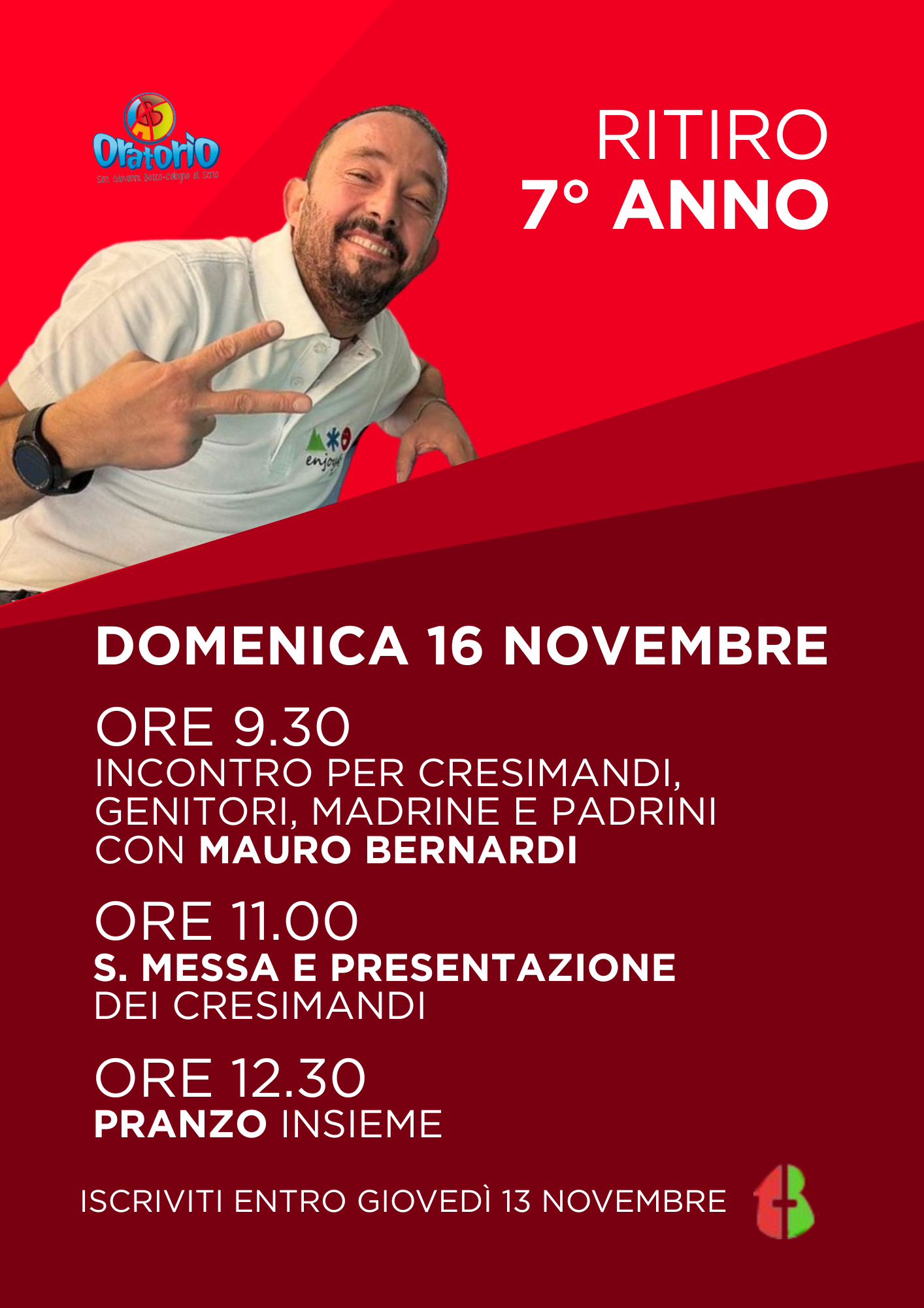 Tutti i cresimandi sono invitati al ritiro, è quindi sospesa per il 7° anno la catechesi di venerdì 14 novembre.
