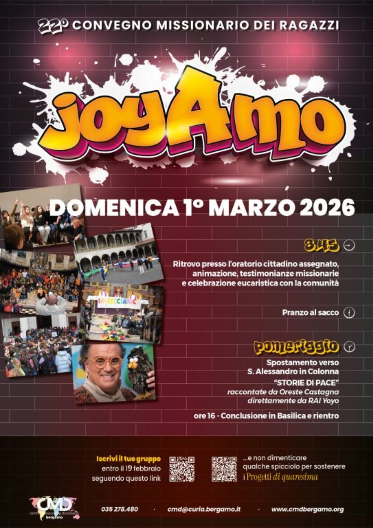 Ore 8.45 accoglienza e animazione con testimonianze e Messa a Bergamo.